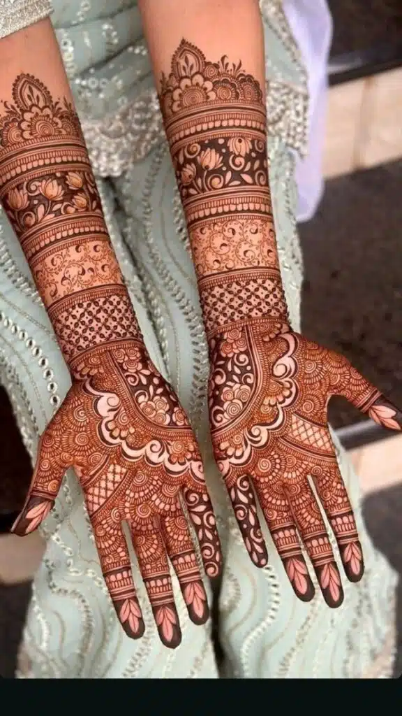 - Indian Dulhan Mehndi: Full hand designs with liar art, frequently including the bridegroom and bachelor’s initials.